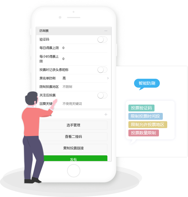 即見(jiàn)即所得,實(shí)時(shí)手機預覽,一分鐘即可創(chuàng )建投票活動(dòng),無(wú)需任何專(zhuān)業(yè)知識。